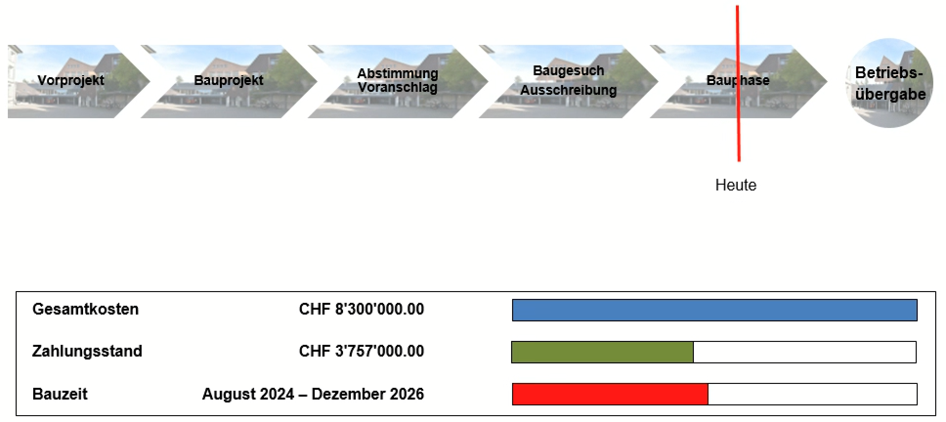 2013 wurden ein Zustandsbericht und ein Sanierungskonzept erstellt. In den Jahren 2014 bis 2016 erfolgten die beiden ersten Sanierungsetappen mit Investitionen von rund CHF 4 Millionen. Dabei wurden insbesondere der Foyerbereich der Turnhalle, die Bibliothek, die Liftanlage, die Gastroküche, die Erstellung der Galerie bzw. des Verbindungsganges oberhalb des Foyers, die Erdbebenertüchtigung, die WC Anlagen und Massnahmen im Bereich Brandschutz und Energie umgesetzt. Mit den anstehenden Arbeiten erfolgt die letzte Sanierungsetappe. Es wurde ein entsprechendes Bauprojekt ausgearbeitet. Dieses beinhaltet schwerpunktmässig die Erneuerung der gesamten Aussenhülle inkl. der Ertüchtigung der Statik, soweit notwendig der Gebäudeinnenräume, der Haustechnik, der Schulküche, der Elektro- und Wasserleitungen, den Ersatz der Gasheizung durch fossilfreie Energieträger, die Realisierung einer Photovoltaikanlage, den teilweisen Ersatz von Mobilien und die Gesamtsanierung der Turnhalle.
